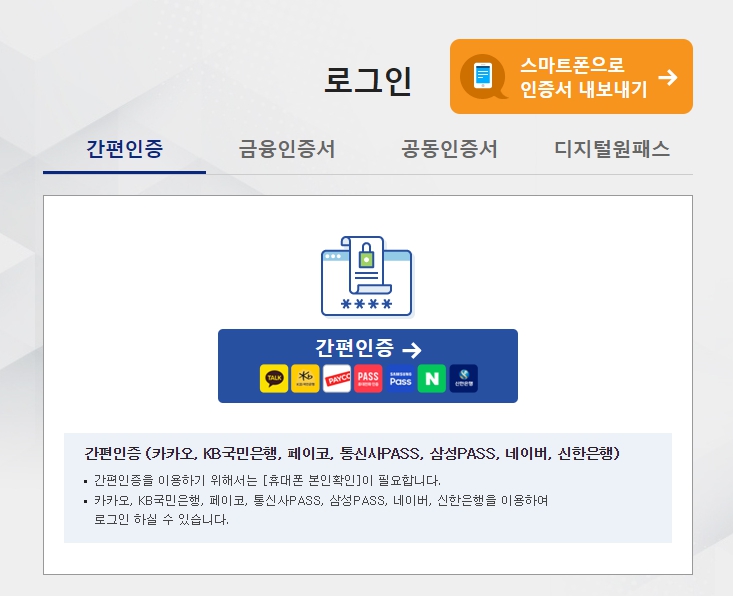 이때 로그인은 반드시 해야하는데요. 여러 인증방법 중에서 본인이 편한 방법으로 선택하면 됩니다. 회원가입은 별도로 하지 않아도 공동인증으로 로그인할수 있어 편리합니다.