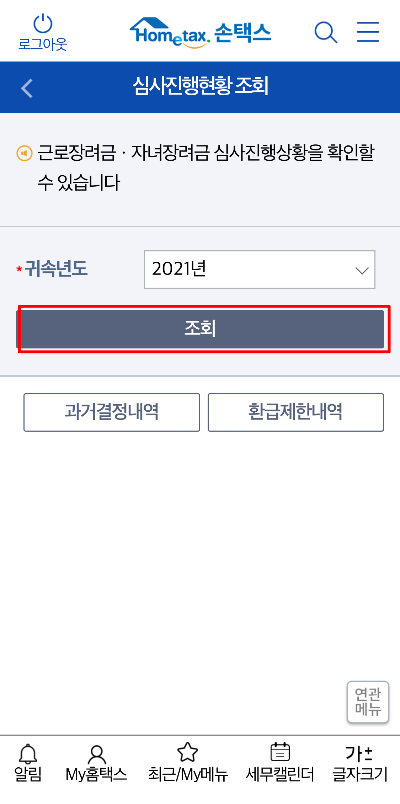근로자녀장려금 정기 심사진행현황조회> 귀속년도 입력 후 조회>