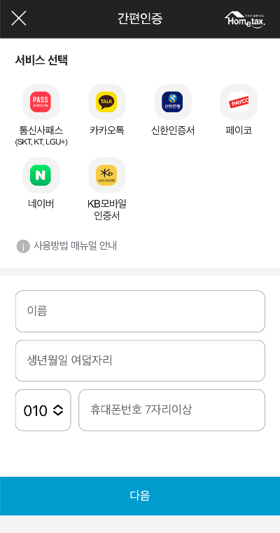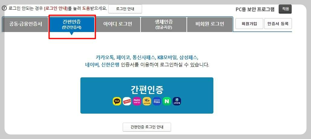 공동인증서(구. 공인인증서)도 가능하며 카카오톡인증이나 통신 3사의 인증도 가능합니다.