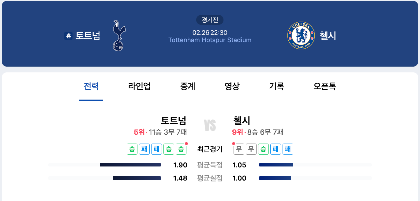2월 26일 일요일 22시 30분 토트넘 VS 첼시
