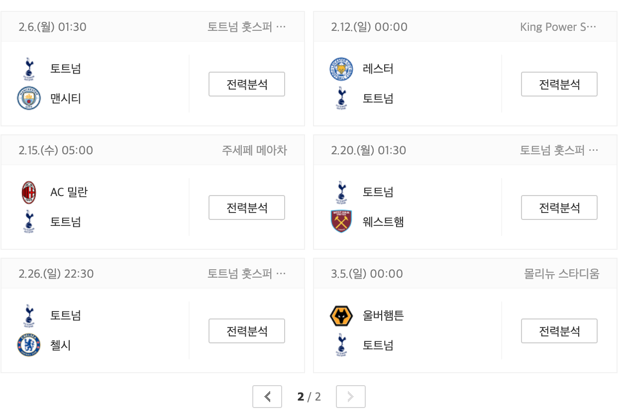 | 2월 12일 일요일 | 00시 00분 | 레스터 VS 토트넘 | 프리미어리그 |