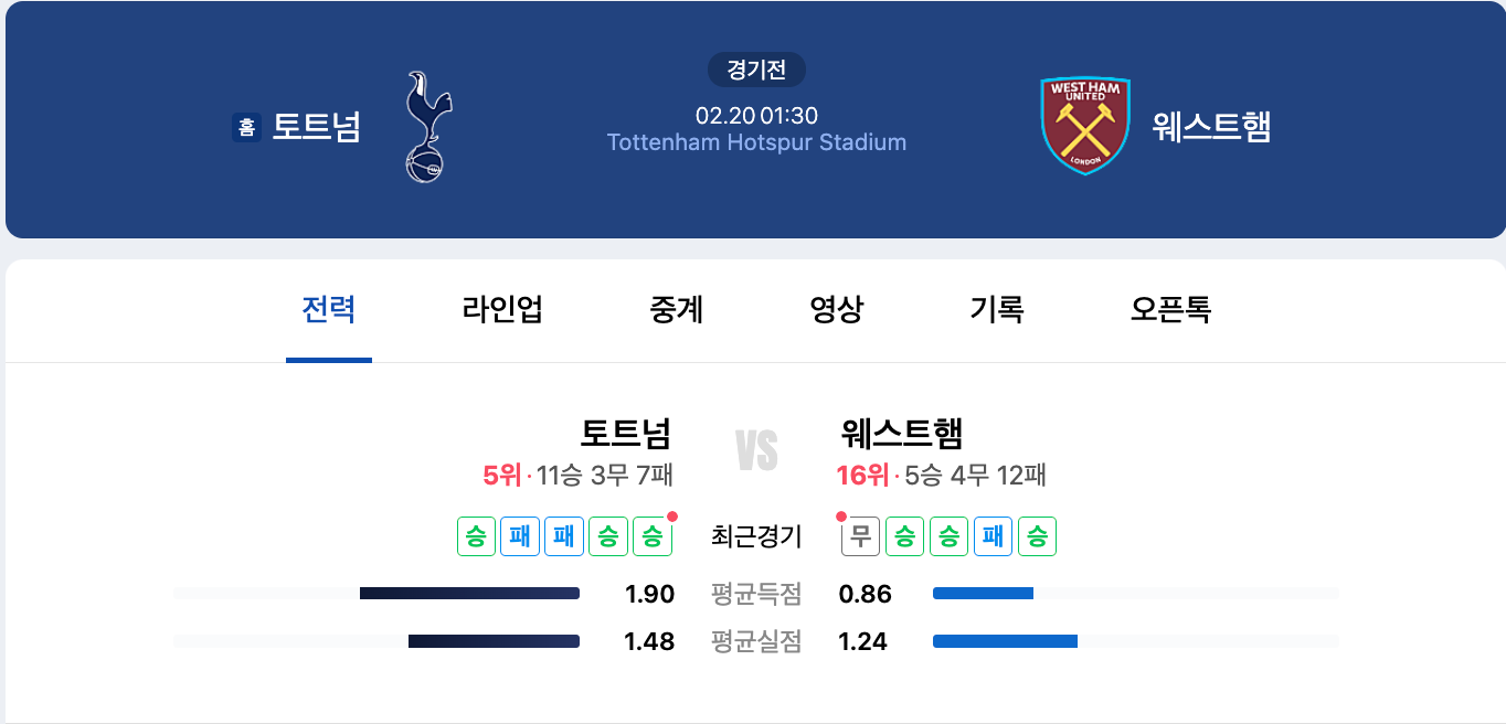 2월 20일 월요일 01시 30분 토트넘 VS 웨스트햄