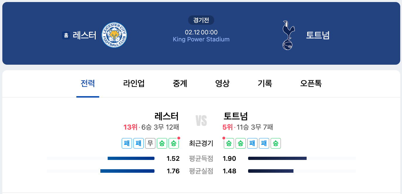 2월 12일 일요일 00시 00분 레스터 VS 토트넘